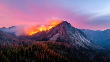 A breathtaking view of a mountain landscape during sunset, showcasing vibrant colors and smoke from a wildfire, creating a dramatic and inspiring scene in nature.