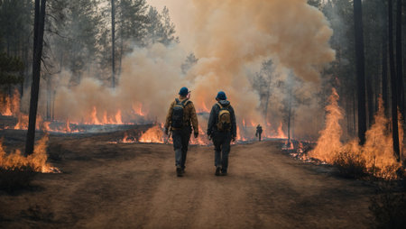 Firefighters and a fire truck on a foggy road combat a surrounding wildfire, embodying bravery and emergency response.