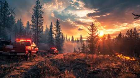 Dramatic wildfire scene with fire trucks and a blazing forest at dusk. Heroic firefighting efforts in harsh conditions.