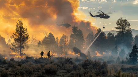 Firefighters coordinating efforts to contain a wildfire, with helicopters dropping water from above.