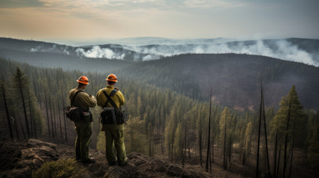 Two forest rangers overlooking a burnt forest landscape with smoke rising in the distance, under a hazy sky