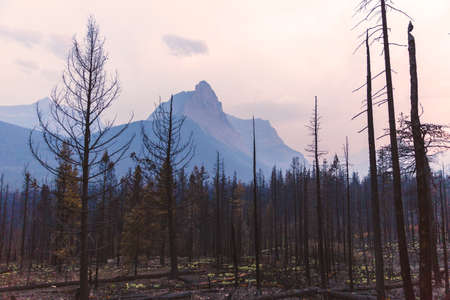 Steep rocky cliffs in a hazy sunset at Glacier National Park. Burned trees in foreground, tall mountains and clouds in background. Forest fire smoke at sunset in Montana.