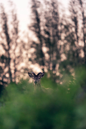 Shot of a deer posing in front of the camera. Selective focus, natural light.