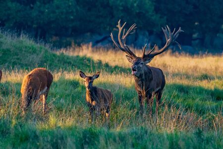 Wild old male red deer is looking to camera by the female red deer on green grass.