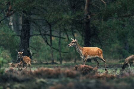 Red deer, rutting season, Slovakia. Deer stag, bellow majestic powerful adult animal outside wood, big animal in forest habitat, Wildlife scene, nature. Heath Moorland, autumn animal behaviour.