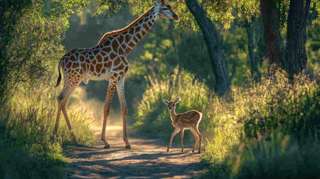 A portrait of a beautiful mother deer with her baby in the wild forest