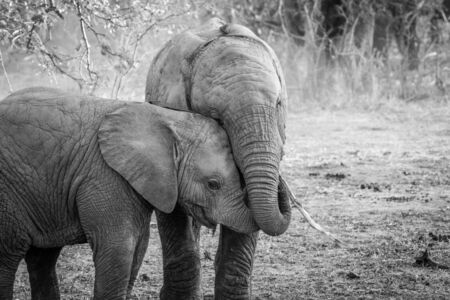 Two young Elephants cuddling in black and white in the Kruger National Park, South Africa.