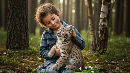 A young boy gently pets a bobcat kitten in a serene forest setting, surrounded by tall trees and lush greenery, conveying a sense of friendship and wonder.