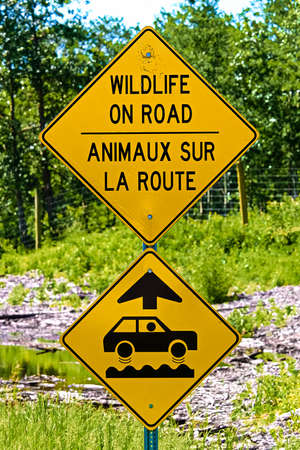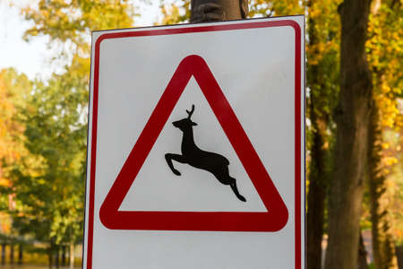 Deer regularly cross this road, be alert for animals sign. Warning road signs, selective focus and close up view with forest trees background