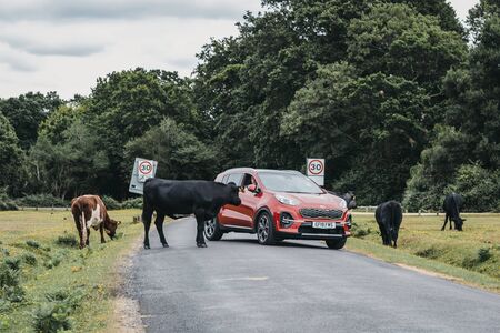 New Forest National Park, UK - July 13, 2019: Red car trying to drive around cows blocking the road inside New Forest, a famous National Park in Dorset, UK.