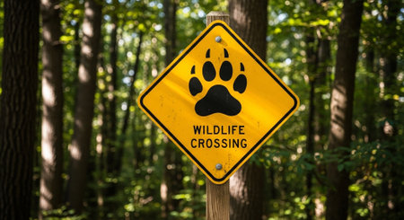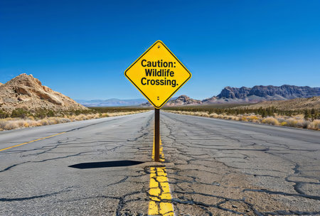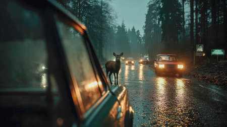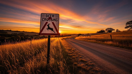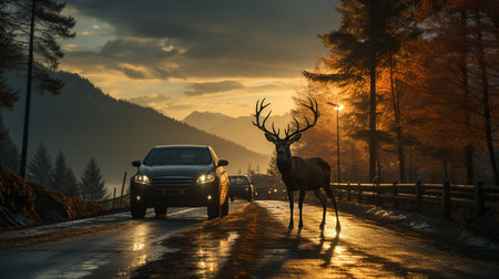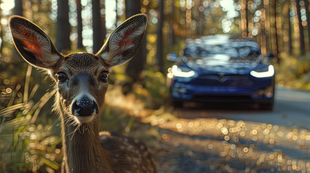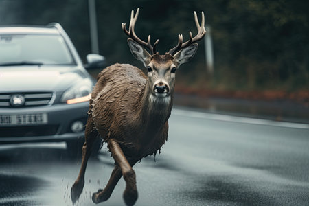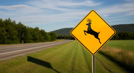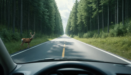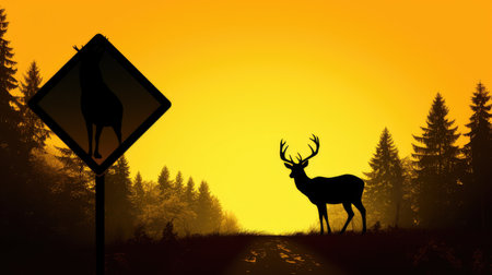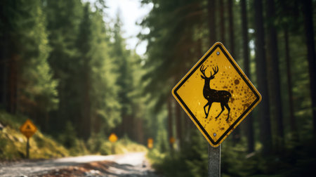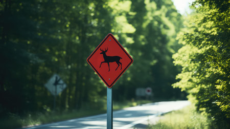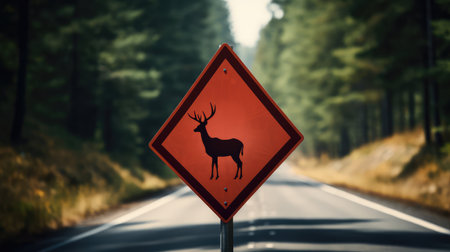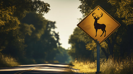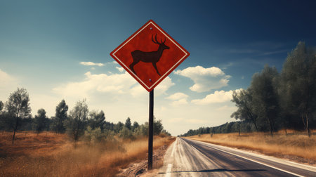 Be aware of deer crossing the road. Caution, wild animals. Ai Generative image