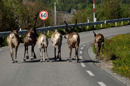Reindeer. Herd of reindeer running across road in autumn season Finland, Lapland.