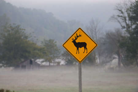 Road sign : Elk Crossing on a foggy morning