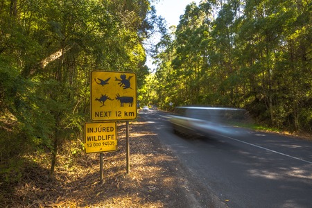 Altered warning sign about Monsters crossing on Austalian forest road and speeding car.