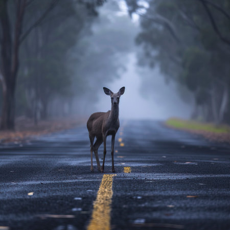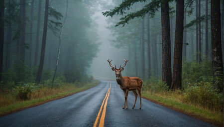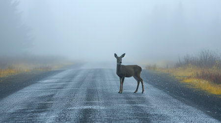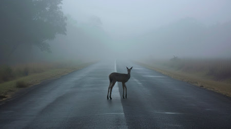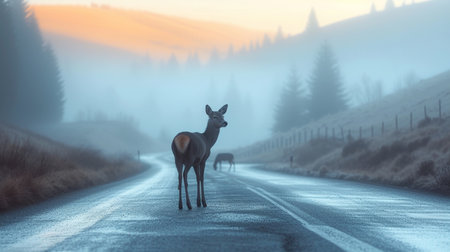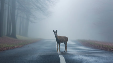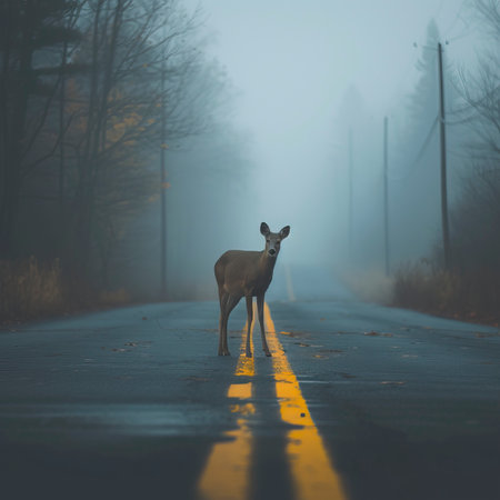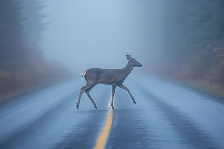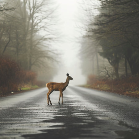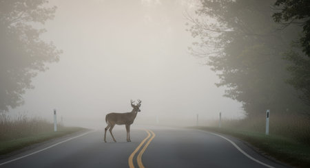 Misty morning with deer on road near forest, potential hazards from wildlife and transport.