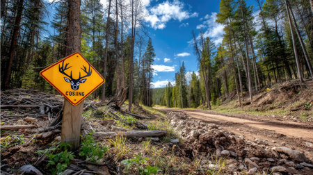 A caution sign warning of wildlife with antlers stands prominently along a dirt road amid tall trees and a vibrant blue sky, evoking a sense of adventure.