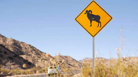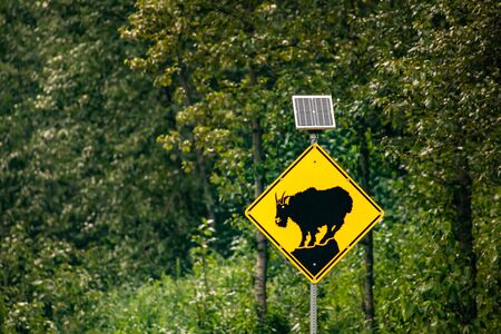 Mountain Goat crossing sign with small solar panel, Warning yellow roads signs in selective focus view with forest trees background