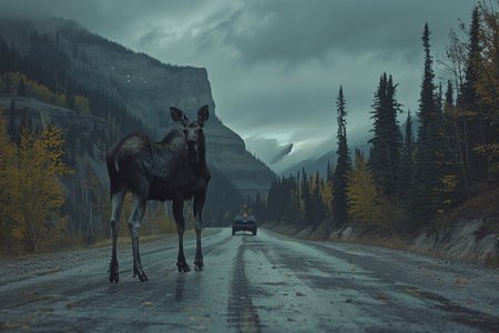 There are a lot of elk on the road. Conservation of wild animals. Safe driving. Generative AI.