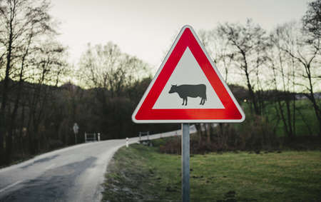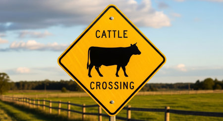 A cow crossing a road sign with the text Cattle Grains