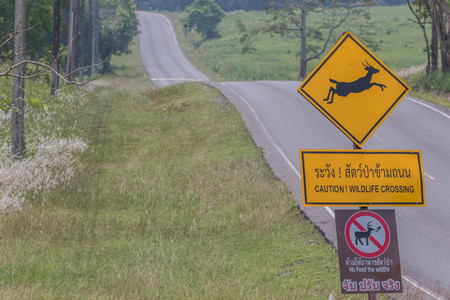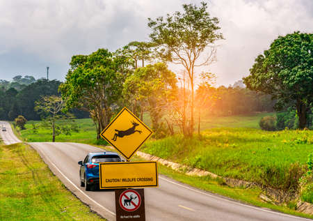Caution ! wildlife crossing sign beside asphalt road near small hill and green grass field. Car of the tourist driving with caution during travel