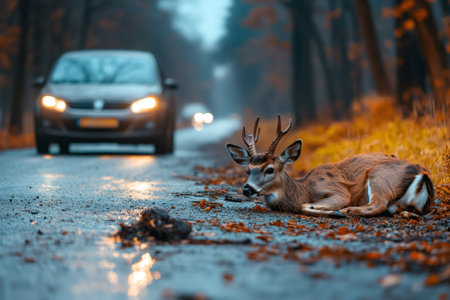 Injured deer lying on the asphalt of a forest road after being hit by a car