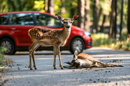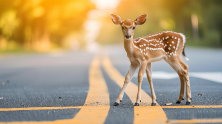 Two fawns stand peacefully on a quiet road during sunset, surrounded by a tranquil nature scene and blurred lights from approaching cars.