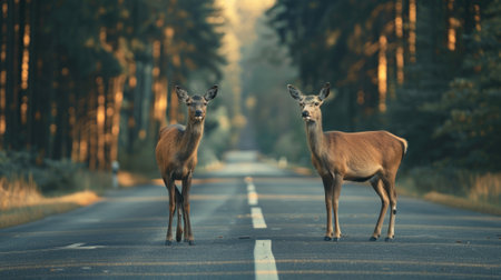 Deers standing on the road near forest at early morning or evening time. Road hazards, wildlife and transport.