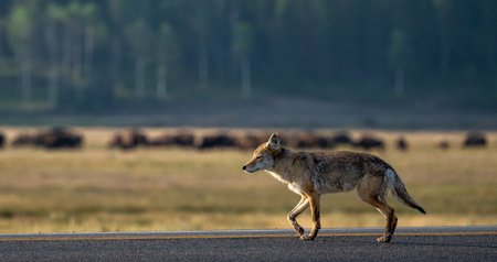 Wild animal on asphalt road in foggy morning