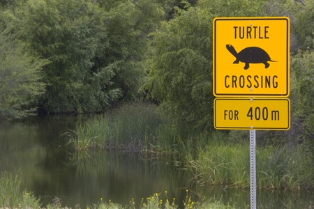 Turtle crossing sign at pond in British Cloumbia horizontal format