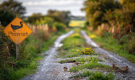 Duck crossing a country road in the countryside with a yellow sign