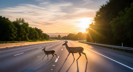 A deer and its fawn are captured crossing a wide, empty highway at sunrise, their long shadows stretching across the asphalt. This beautiful yet poignant photograph highlights the intersection of wildlife and human infrastructure, symbolizing danger and coexistence.