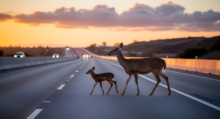 A mother deer and her young fawn bravely cross a busy multi-lane highway at sunset, with car headlights approaching in the distance. This poignant image highlights the dangers wildlife face and the conflict between animal habitats and human infrastructure.
