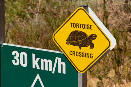 Western Cape, South Africa. 2022. Tortoise crossing road sign with 30 KM speed green sign. Western Cape, South Africa.