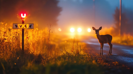 A captivating image showcasing a deer crossing sign illuminated by soft lights amid a foggy evening. The tranquil atmosphere highlights nature's beauty and road safety.