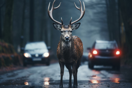 Deer standing on road near forest in winter morning with road hazards and wildlife in transport area