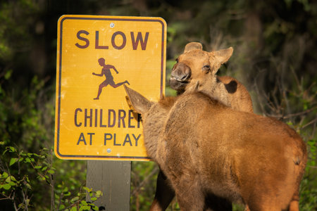 Two moose calves playing in the parking area in Denali National Park in Alaska