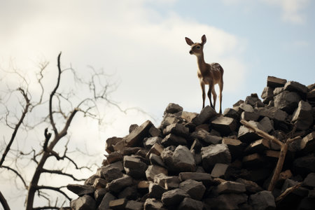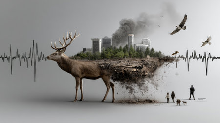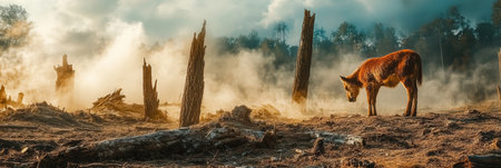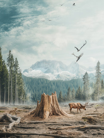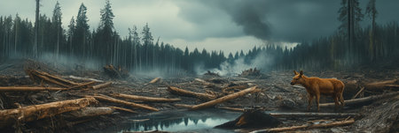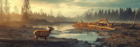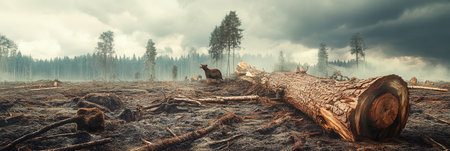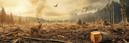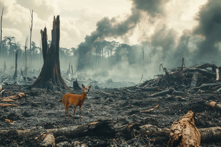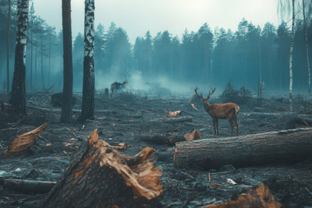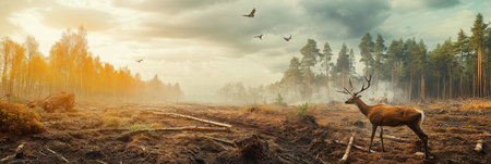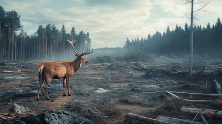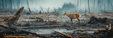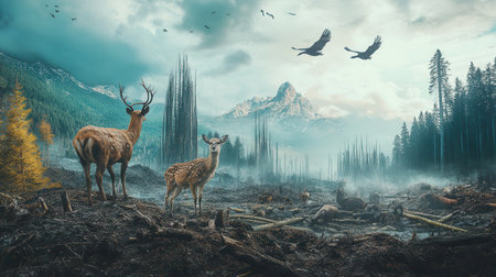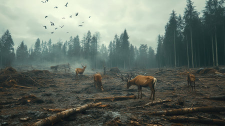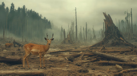 Deer wandering through a devastated forest landscape after an environmental disaster such as deforestation or a natural disaster