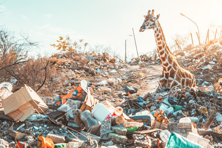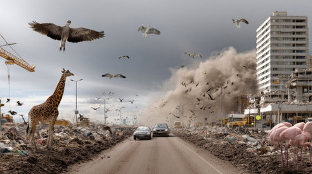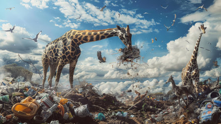 Surreal digital image showing giraffes interacting with a nest on a polluted land, evoking environmental concerns.