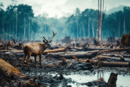 A solitary deer gazes across a barren landscape scarred by deforestation, highlighting the urgent plight of endangered species.