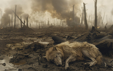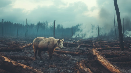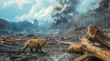 In a devastated landscape, a rare animal walks through the remnants of a deforested area, highlighting species loss and extinction.