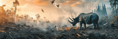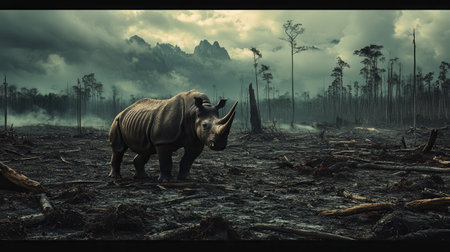 A rhinoceros stands amidst a devastated land, symbolizing the urgent extinction crisis faced by vulnerable species and habitats.