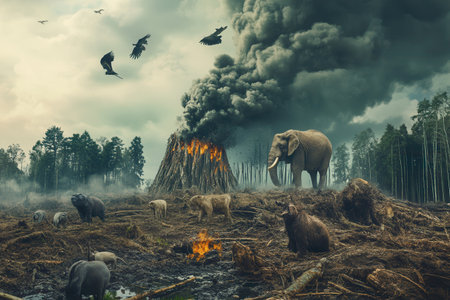 Amidst the devastation of deforestation, rare animals struggle for survival in a landscape filled with smoke and fallen trees.