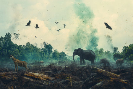 As could rise from industrial activity, rare animals stand amidst fallen trees, highlighting the urgent issue of habitat destruction.