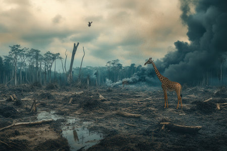 A giraffe surveys a deforested landscape filled with smoke, representing the impact of habitat destruction on rare wildlife.