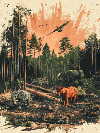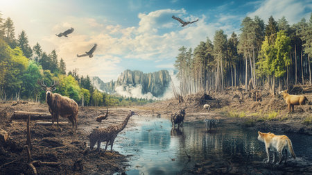 Endangered animals wander through a deforested area, highlighting the urgent threat of species loss and habitat destruction.