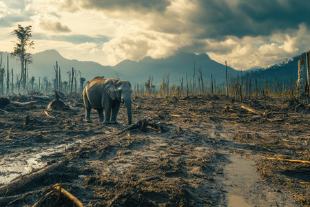 Elephants stand amidst felled trees and barren land, symbolizing the urgency of protecting endangered species from extinction.