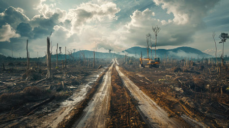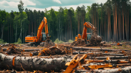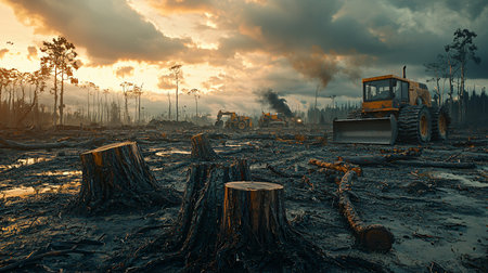 A deforestation site with tree stumps and bulldozers clearing the land, showcasing environmental destruction and the loss of natural habitats.