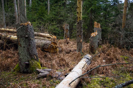 Broken tree trunks in the forest after storm. Fallen trees in the woods after hurricane