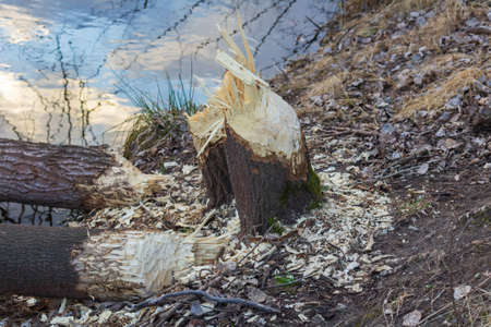 Detail of damaged trees by european beaver, castor fiber. Animal build his dam
