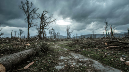 A haunting scene depicting a devastated landscape after a severe storm. Fallen trees and a bleak sky create an atmosphere of desolation and loss in nature.
